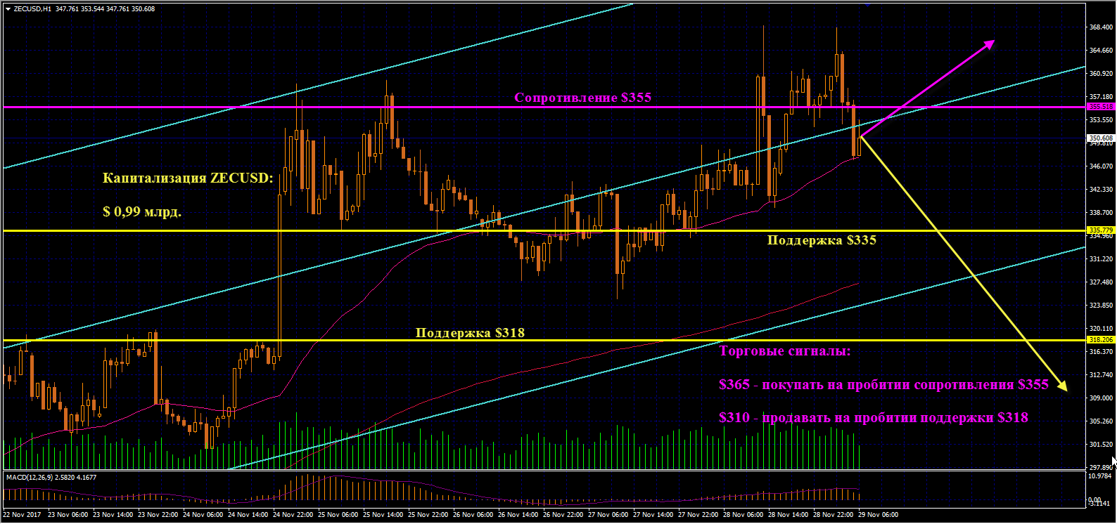 ZECUSD: Zcash продолжает рост вдоль центральной линии восходящего канала. Тестирование сопротивления $355 закончилось поражением быков, возможен откат к нижней границе аптренда, от которой можно взять лонги. Наращивать их будем по цене от $365 после того, как монета пробьет сопротивление $355. Если произойдет разворот, и Zcash выйдет из границ канала вниз, дожидаемся пробития поддержки $318 и продаем актив, начиная с отметки $ 310.