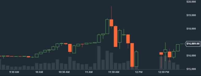 В рамках нового невероятного ралли стоимость биткоина выросла более чем на $5,000 в течение 12 часов. Путь от $17,000 до $18,000 занял всего 15 минут, тогда как скачок с $18,000 до $19,000 произошел всего за 5 минут. В 18:30 по Москве этот рост закончился, Bitcoin достиг $19,697, угрожая пороговым $20,000.