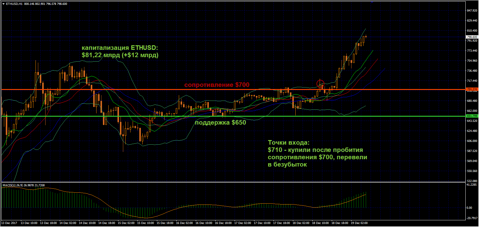 ETHUSD: Ethereum спустя 5 сессий вырвался из бокового канала $650-$700, пробив сопротивление на сессии понедельника, а уже сегодня развила преимущество до нового исторического максимума — $802,90. Также сработал наш сигнал на покупку с $710 после пробития $700 уровня, сделку переведем в безубыток, либо можно зафиксировать профиль, чтобы избежать рисков связанных с нисходящей коррекцией. По Боллинджеру и MACD возможен разворот вниз, однако Alligator по-прежнему сигнализирует о росте. Следующий уровень — $850, который ETHUSD может покорить уже на этой неделе.