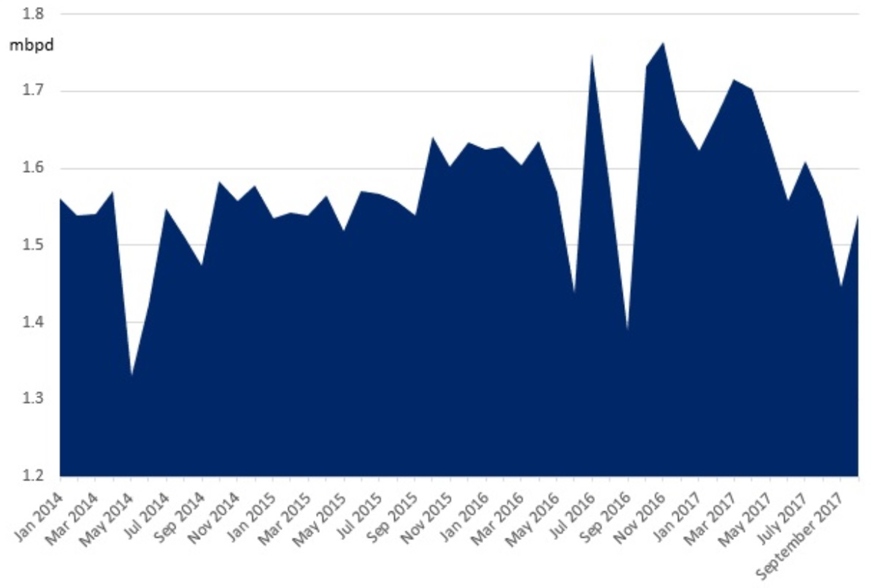 Перипетии, связанные с добычей нефти, также ухудшили прогноз Норвегии на 2017 г. В этом году объем производства снижен (данные за январь-октябрь указывают на 1,605 млн баррелей в сутки против прогноза в 1,621 млн баррелей в сутки). Во многом это было связано с трудностями в отношении месторождения Голиаф - первого задействованного норвежского месторождения в Баренцевом море. Голиаф был закрыт на месяц в сентябре 2017 г. на ремонтные работы, однако в октябре прошла еще одна незапланированная остановка, поскольку норвежские власти приказали ENI прекратить деятельность ввиду серьезных нарушений в электросистеме платформы. На фоне перебоев в подаче электроэнергии будущее платформы повисло в воздухе, поскольку норвежские власти провели тщательный анализ, до того как производство могло бы быть возобновлено, восьмой раз с момента его начала в начале 2016 г.