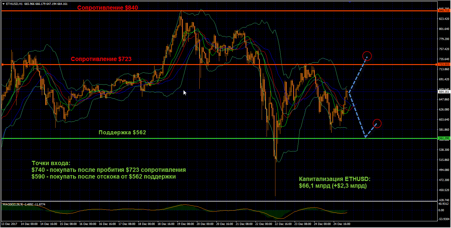 ETHUSD: Хорошим рывком для Эфириума послужил бычий импульс с $580 до $660 за последние часы торговой сессии. Монета остановила предшествующее снижение на отметке в $500 и в следующие несколько часов образовала новый диапазон поддержки $515 — $560. При возвращении к нему рассматриваем открытие новых длинных позиций на $590, после отскока. Восходящая динамика сейчас подтверждается пересечением сигнальных линий Боллинджера снизу вверх и это может также послужить хорошим сигналом для быков на отметке $740. При движении цены в течении ближайших торговых сессий в границах диапазона 562-723 открывать новые позиции пока не будем, лучшим сценарием при таком варианте развития событий было бы ожидание новых ценовых импульсов.