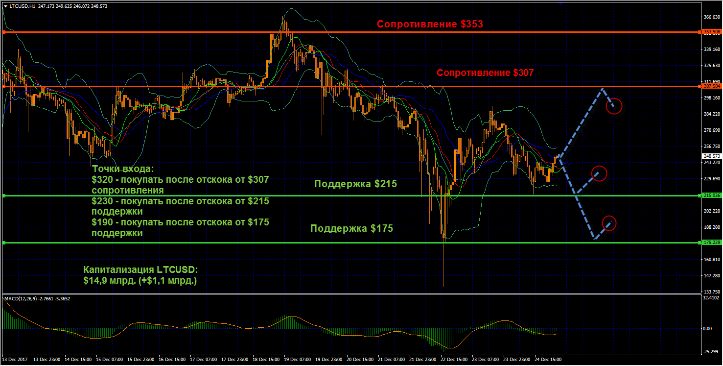LTCUSD: Лайткоин на протяжении выходных сформировал паттерн «голова и плечи», если взглянуть на часовом и получасовом графике, образовав шею на отметке $229. Тем временем поддержка $215 оказалась не совсем подъемной для медведей и пара продолжает торговаться в диапазоне $215-$270. Недавно была пробита средняя полоса Боллинджера, что указывает на наличие восходящей динамики на рынке, несмотря на сформировавшийся паттерн. Ближайшими удачными точками входа в случае подтверждения сигнала на покупку видим шорт на $290, после отскока от $307 сопротивления. Если же последствия формирования головы и плеч подтвердятся, то будем лонговать на отскоке от ближайших значимых уровней поддержки, на отметках $235 и $1.