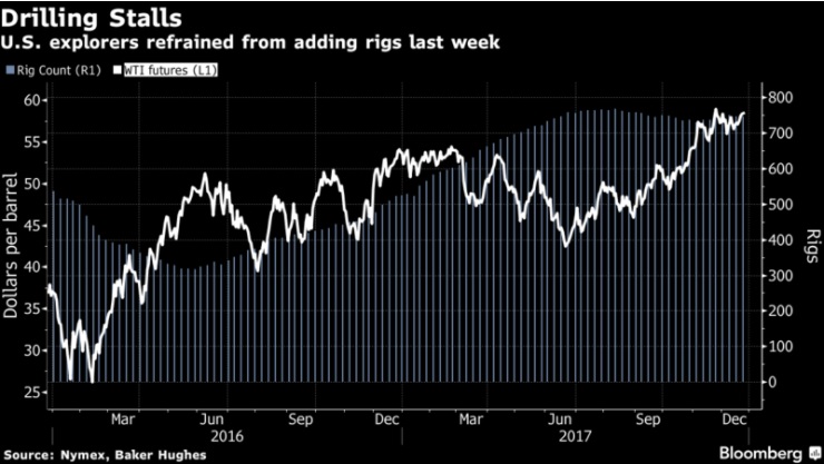 Нефть держалась выше $58 за баррель по мере возобновления трейдинга после Рождества, тогда как американские компании воздерживались от добавления новых буровых вышек вторую неделю подряд. Фьючерсы демонстрировали незначительные изменения в динамике в Нью-Йорке после роста на 2% на прошлой неделе. Количество буровых вышек в США оставалось неизменным, показали данные Baker Hughes в пятницу. Починка трубопровода из Северного Моря завершена, проходит тестирование оборудования, заявил оператор Ineos Group в понедельник. Перебои с поставками толкнули цены в вверх в этом месяце.