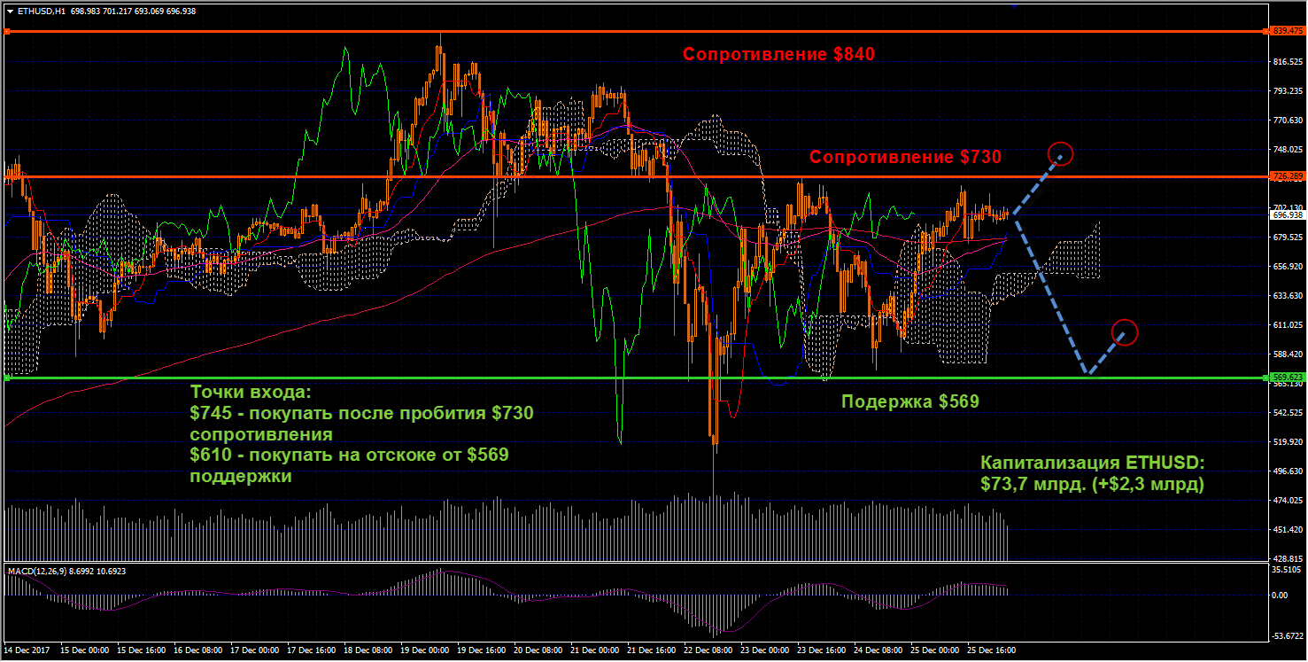 ETHUSD: Эфириум, в отличие от многих альткоинов, сегодня показал лучшую динамику движения, прибавив 4,1% к стоимости. На текущий момент цена уже вплотную подбирается к $730 сопротивлению, после пробития которого рекомендуем открывать среднесрочные длинные позиции с целью новых максимумов. Монета движется над облаком Ишимоку, также MACD преодолел нулевую отметку, что подтверждает наши сигналы насчет лонгов. Если же консолидация в области 570-700 затянется на некоторое время, то будем рассматривать это как возможность для наращивания позиций.