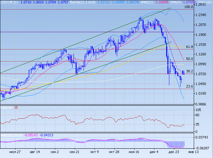 Свисси утратил часть позиций, пара вернулась в район поддержки/сопротивления 38,2% Фибоначчи на 1,0725. В ближайшие сессии ожидаем борьбу за эту отметку. Сопротивление проходит по 1,0835. Поддержку будет оказывать отметка 1,0575. Серия поддержек для доллара расположена в области 1,0600-1,0460. Прорыв поддержек приведет к тестированию минимумов в районе 1,0395.