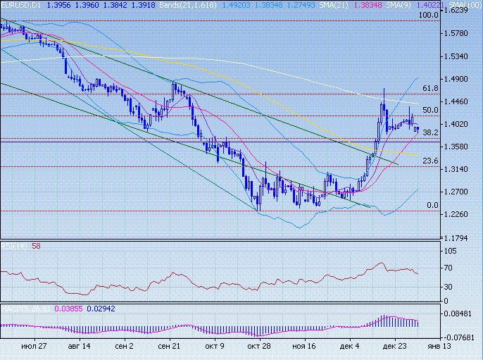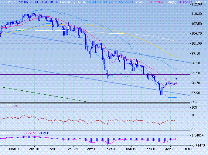 Доллар вырос на тонких торгах в отсутствии основных игроков. Наблюдаем пересечение 9 МА и 21 МА в сторону роста доллара, что окажет на Йену давление. Вероятен рост доллара под верхнюю границу полосы Боллинжера в районе 94,50. Сопротивление при росте окажут отметки на 93,10. Поддержка расположена на 90,70. Ожидания роста йены к поддержке канала не оправдались.