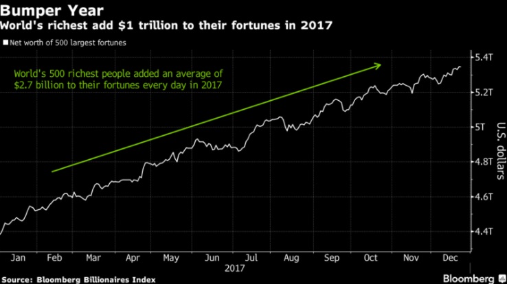 Джордж Сорос также выделил $18 млрд. Open Society Foundations на благотворительность, что отбросило миллиардера на 195 место в ранге Bloomberg с состоянием в $8 млрд. К вечеру вторника 26 декабря богатейшие 500 человек владеют $5.3 трлн. против $4.4 трлн. 27 декабря 2016 года. 38 китайских миллиардеров надули индекс на $177 млрд. в 2017 году, таким образом, это 65% рост был крупнейшим среди представленных 49 стран. Состояние Хуэй Ка Яня, основателя China Evergrande Group, выросло на $25.9 млрд., таким образом, это скачок на 350% с прошлого года и второй крупнейший долларовый результат в индексе после Безоса.