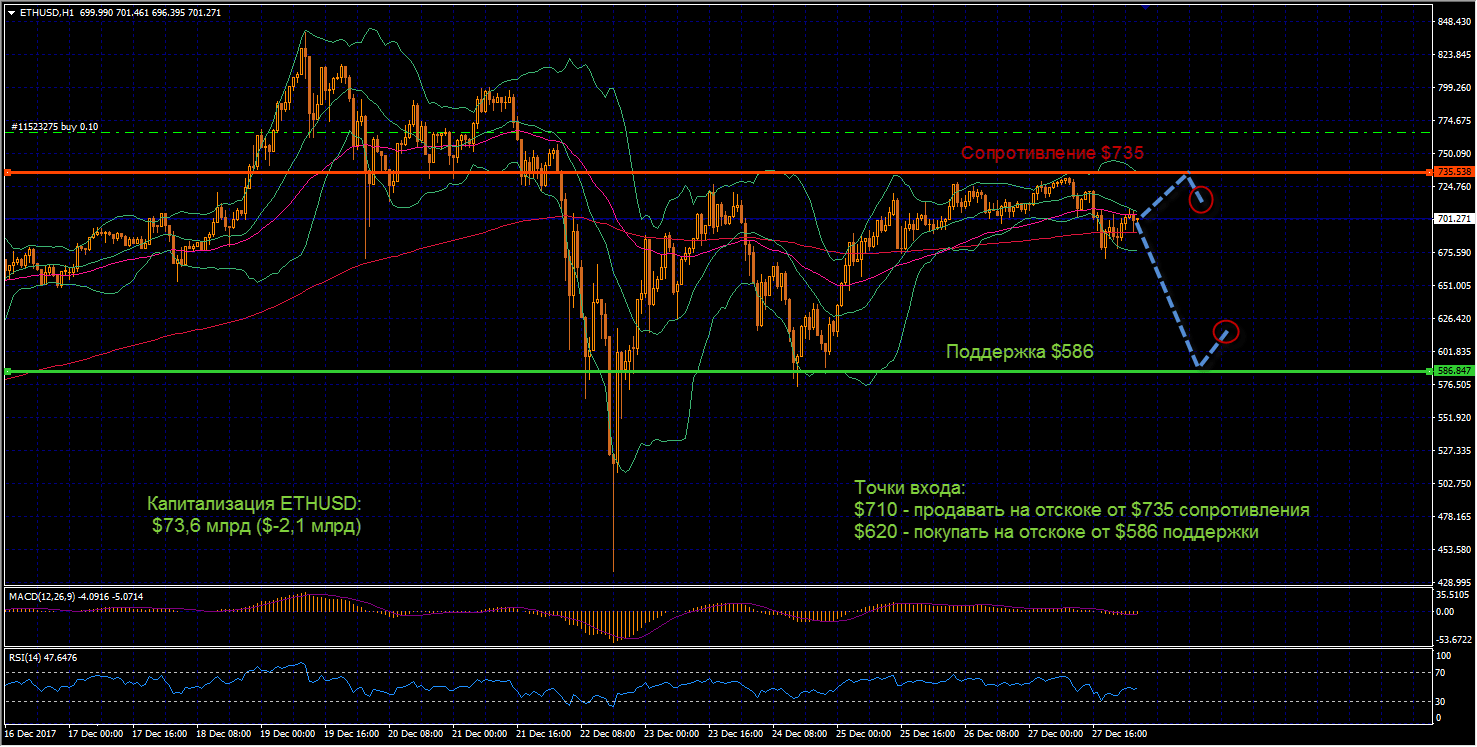 ETHUSD: На минувшей торговой сессии быки по ETHUSD пытались проторговать значимый диапазон сопротивления $730-$735, но попытки оказались безуспешными, сигнал на покупку не сработал. К середине азиатской сессии монета торгуется примерно на тех же отметках, что и вчера ($700). Bollinger Bands консолидирует уровень цен около средней полосы, что говорит о наличии боковой динамики, значение индикатора MACD также находится вблизи нулевой отметки. Если следующая попытка пробить сопротивление не увенчается успехом, то встанем в шорт от уровня $710. Новые длинные позиции откроем также при отскоке от локальной $586 поддержки.