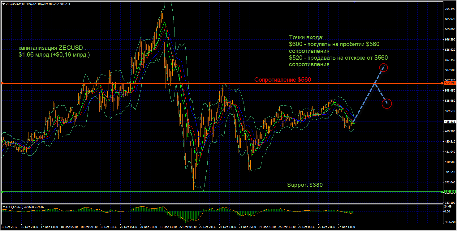ZECUSD: Zcash медленно, но верно отрабатывает сформировавшееся двойное дно, торгуясь на отметке $490. Текущее движение пока что полностью укладывается в рамки основного сценария, который предполагает повышательный тренд в течении нескольких торговых сессий. За последние часы цена пробила среднюю полосу Боллинджера, также MACD на малых таймфреймах подтверждает бычьи настроения на рынке. Открывать позиции по монете все также планируем от ключевого уровня сопротивления — $562, лонг от $600, шорт от $520. В случае образования боковой динамики, основная рекомендация – «держать».