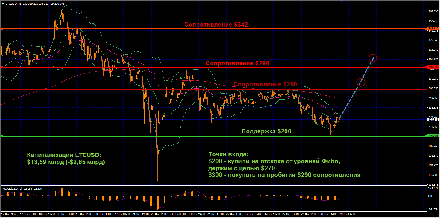 LTCUSD: Медведи по LTCUSD все-таки взяли свое, и за день монета успела отпуститься до $200, в связи с чем нам представилась возможность войти в лонг, согласно предыдущему сценарию. На текущий момент цена составляет $220, сейчас в профите на 10%. Если в ближайшее время цена не оттолкнется от верхней полосы Боллинджера, то буду рассматривать рост вплоть до $270, где как раз располагается сильный диапазон сопротивления. Если же и этот уровень монета сумеет преодолеть без проблем, то будем наращивать лонги с $300, параллельно закрывая оставшиеся позиции от предыдущих покупок.