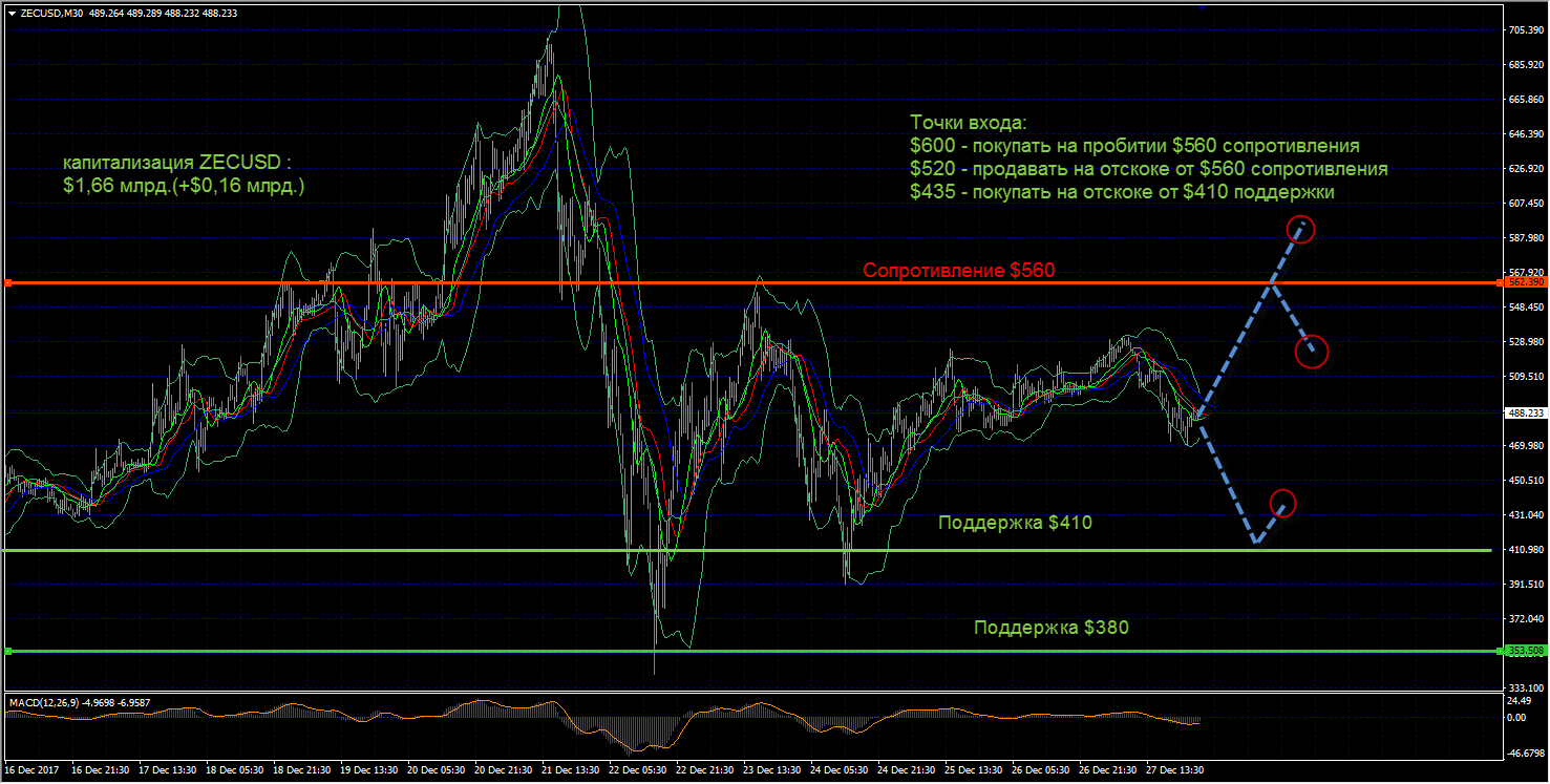 ZECUSD: Zcash в течении последней торговой сессии незначительно просел, подобно другим криптовалютам. Проторговать сопротивление $560 так и не вышло, от вчерашних значений цена так и не ушла выше. MACD на небольших таймфреймах сигнализирует о медвежьей динамике, средняя полоса Боллинджера также подверглась пересечению сверху вниз. Если де медвежьи настроения на рынке сохранятся в течении ближайших сессий, то в качестве новой точки входа рассмотрим покупку от $435, после отскока от $410 поддержки. Основным «рабочим диапазоном» также остается $560 сопротивление.