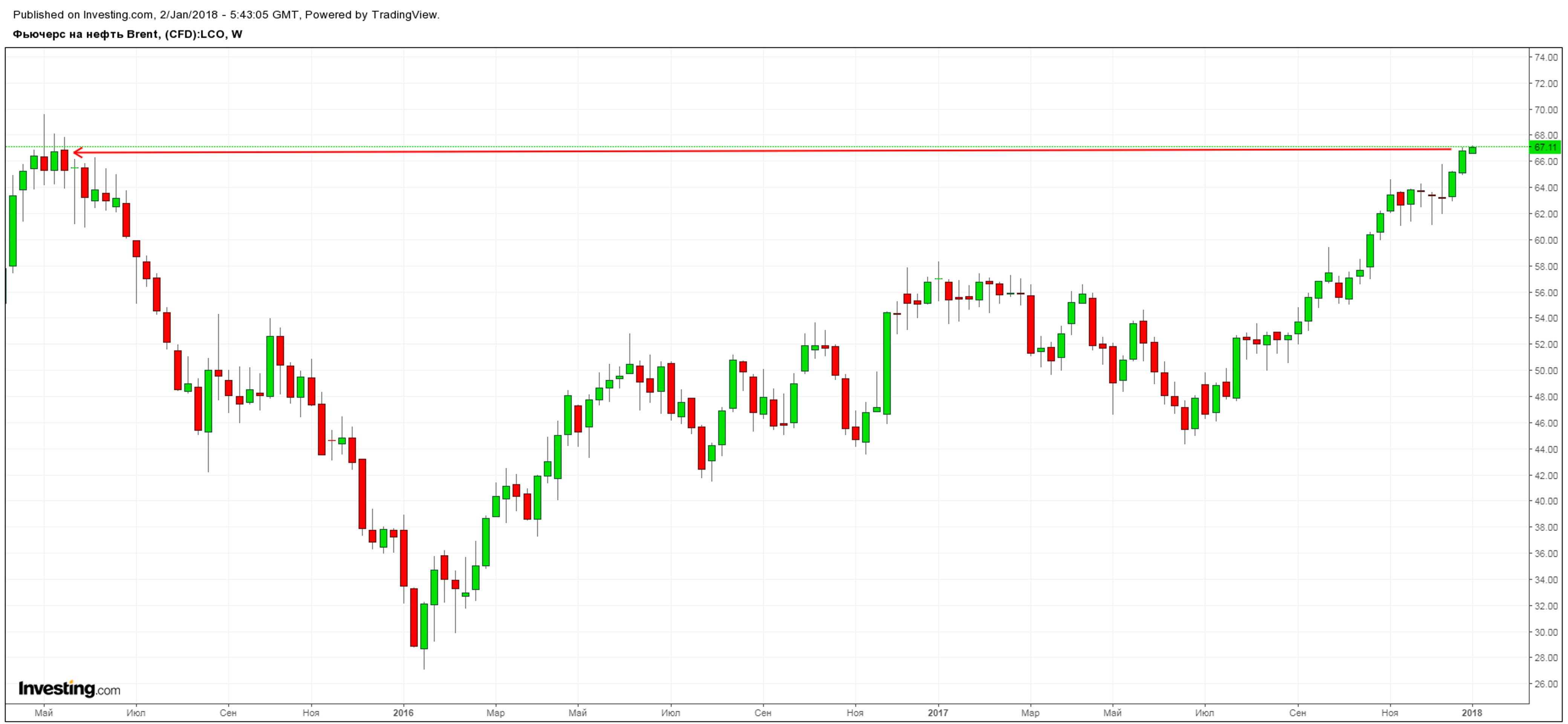 Цены на нефть марки Brent прибавляют около 0,7%, превысив отметку в $67 за баррель - впервые с весны 2015 года.
