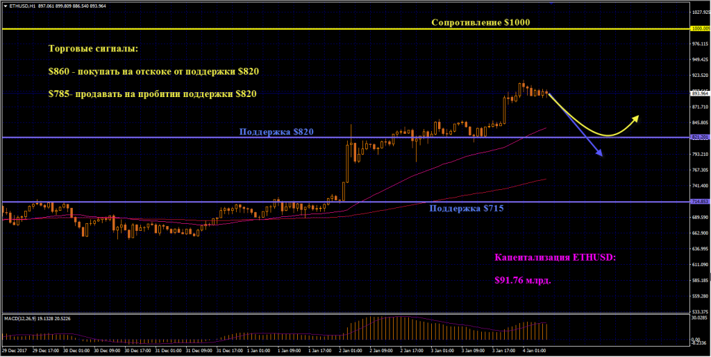 ETHUSD: После долгого тестирования поддержки $820 сверху Эфириум продолжил активный рост. На азиатской сессии началась нисходящая коррекция, которая может вернуть котировки к уровню $820 еще раз. В таком случае пользуемся отскоком от поддержки, чтобы долиться в лонги по цене от $860. В пользу покупок говорят скользящие средние: ЕМА50 пересекла