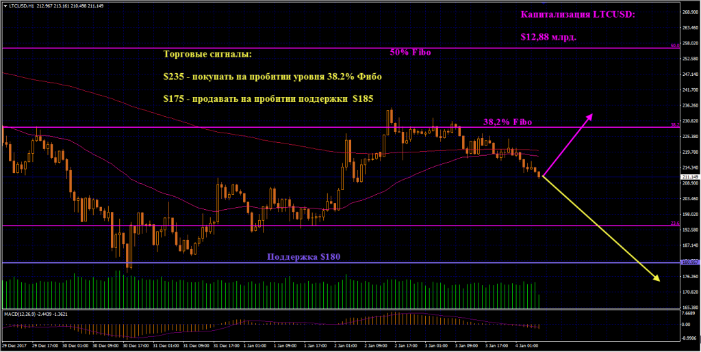 LTCUSD: Тестирование уровня 38,2% Фибо оказалось неудачным для быков. Лайткоин начал нисходящую коррекцию, пробив сверху вниз ЕМА50 и ЕМА200. Если напора медведей хватит для пробития поддержки $180, продаем Лайткоин, начиная с отметки $175. Покупки возобновляем после того, как монета закрепится выше уровня 38,2% Фибо. Начинаем в таком случае с отметки $235.
