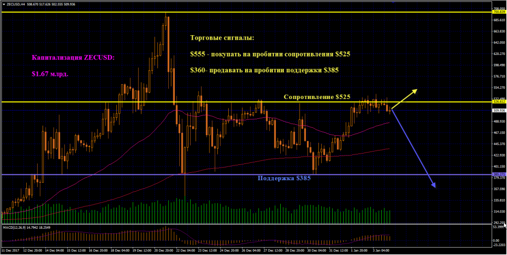 ZECUSD: Zcash почти две недели торгуется в широком боковике между уровнями $385 и $525. В течение последних торговых сессий быки активно тестируют верхнюю границу диапазона, удерживая котировки выше скользящей средней ЕМА50. Индикатор MACD на фоне этого вышел в положительную зону. Наиболее вероятным выглядит пробой диапазона вверх. После закрепления над сопротивлением $525 покупаем монету по цене от $555. Продажи начинаем с отметки $360, если будет пробита поддержка $385.