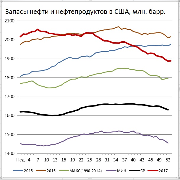 Суммарные запасы нефти и нефтепродуктов за неделю подросли на 1,5 мб, (до 1889,0 с 1887,5 мб неделей ранее), подходя к окончанию года существенно ниже уровней 2015 и 2016 годов. Небольшое подрастание запасов уже не смогло изменить общей годовой картины, когда снижение от максимумов февраля текущего года составило очень солидные 166 мб! — Старания ОПЕК+ в 2017 году принесли свои плоды.
