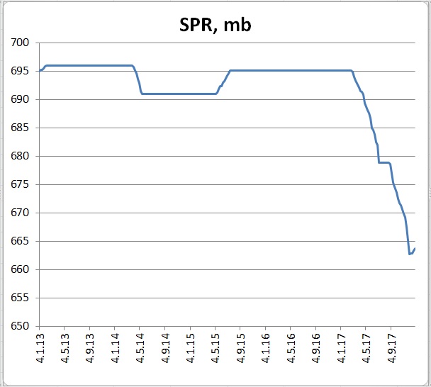 За прошедшую неделю запасы моторного топлива подросли на 4,8 мб. Стратегические запасы подросли на 0,4 мб. Как видим, заминка в снижении SPR продолжилась, но все равно с плато 2016 года потери по этой позиции составляют вполне солидные 31,4 мб.