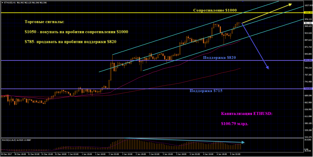 ETHUSD: Эфириум растет в рамках узкого восходящего канала, приближаясь к психологическому сопротивлению $1000. В случае пробития этого уровня вверх наращиваем лонги, начиная с отметки $1050. Наиболее удачные точки входа в длинные позиции находятся на нижней границе аптренда, которую поддерживает ЕМА50. MACD демонстрирует легкую медвежью дивергенцию, подавая сигнал для продаж. Если начнется снижение цены, и котировки Эфира пробьют поддержку $820, входим в шорты по цене от $785. Капитализация Эфириума превысила отметку $100 млрд., достигнув исторического максимума $100,79 млрд.