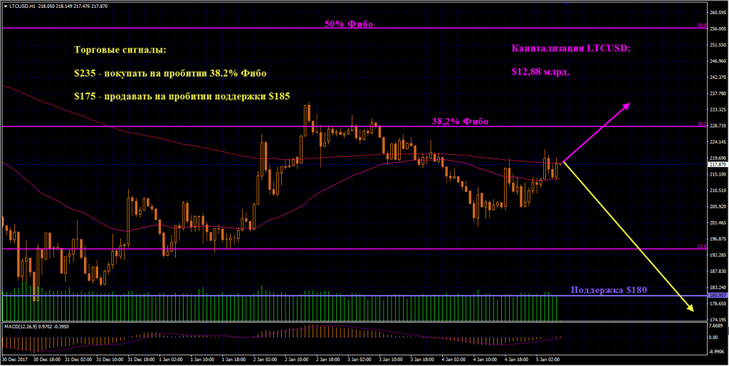 LTCUSD: После нисходящей коррекции от уровня 38,2% Фибо Лайткоин попытался сформировать двойное дно. Шею фигуры пробить не удалось из-за давления сверху скользящих средних ЕМА50 и ЕМА200. Индикатор MACD при этом вышел в положительную зону, что внушает надежду быкам. В случае продолжения роста и пробития уровня 38,2% Фибо покупаем Лайткоин по цене от $235. Шорты открываем, начиная с отметки $175, если будет пробита поддержка $185.
