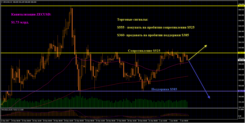 ZECUSD: Диапазон торговли Zcash сузился еще сильнее. Сверху давит уровень сопротивления $525, который монета не может пробить с конца декабря, а поддержку снизу оказывает скользящая средняя ЕМА50. Если состоится выход из боковика вверх, покупаем Zcash по цене от $555. Если медведи пробьют вниз скользящие средние ЕМА50 и ЕМА200, а затем и поддержку $385, продаем монету, начиная с отметки $360.