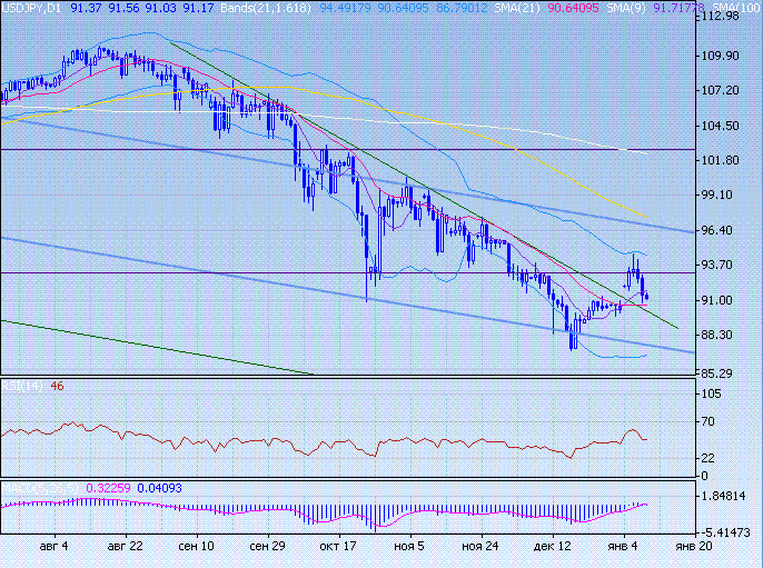 Йена укрепилась в район понижательной линии тренда (90,60), там же проходит поддержка 21 МА. Торговля проходит в середине полосы Боллинжера и прорыв поддержек в виде скользящих средних приведет к укреплению йены в район 90,20, где проходит сильная поддержка – понижательная линия сопротивления, ее прорыв откроет дорогу к тестированию минимумов 2008г.