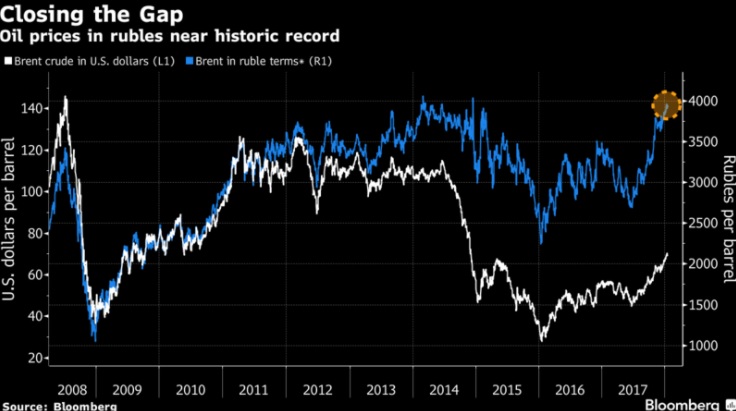 В рамках глобального рынка Brent до сих пор на $50 ниже максимума 2014 года, тем не менее, для российских производителей цена эталонной марки в рублях все равно близка к рекордной благодаря слабой валюте. Новая правительственная программа валютных закупок, как прогнозируется, ограничит потенциал роста рубля в этом году, а в ближайшие недели может произойти временное снижение нацональной валюты, заявили аналитики UBS Group AG в отчете от 11 января.