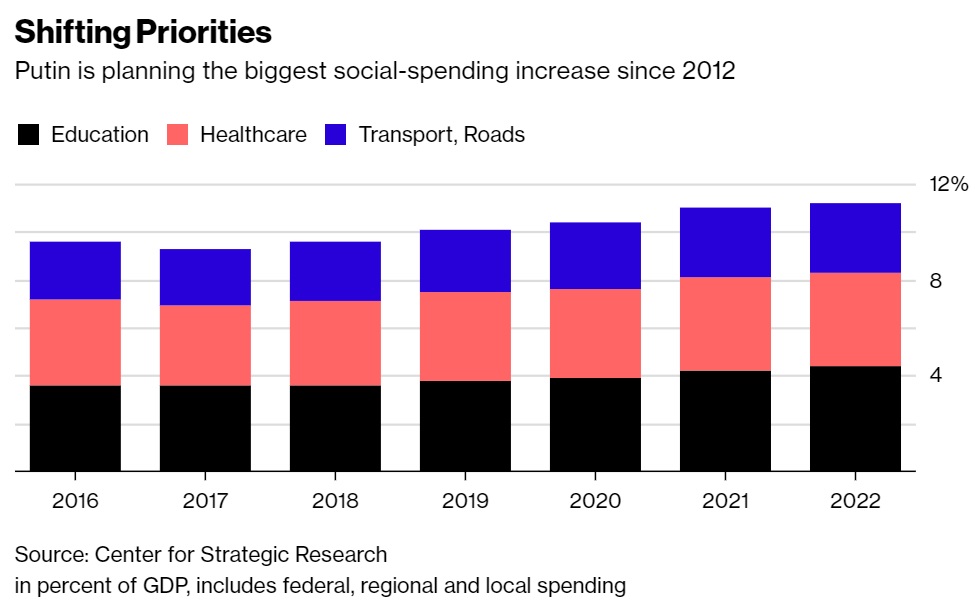 Жесткий контроль за СМИ и политической оппозицией позволят Кремлю быть уверенным в том, что обсуждение не повлияет на поддержку Путина. Опросы показывают, что он победит с подавляющим большинством, тем не менее, Кремлю необходимо обеспечить высокую явку, чтобы сделать неоспоримым его новый срок. Публично же Путин сконцентрируется на повышении расходов: почти 30% на здравоохранение, образование и инфраструктуру (около 2 трлн. рублей или $35 млрд.) в течение следующих 6 лет. Таким образом, это крупнейшее увеличение со времен повторного вступления в должность в 2012 году. Вероятно, частично он объявит о планах во время выступления 6 февраля.