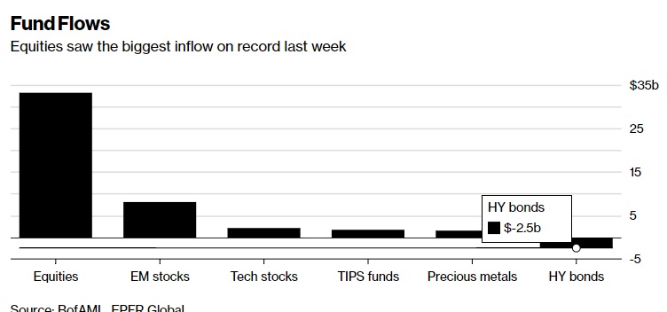 В Bank of America Merrill Lynch, ссылаясь на данные EPFR, заявили, что инвесторы направили в сторону акций $33.2 млрд. в течение недели вплоть по 24 января. Активно управляемые портфели акций, технологические фонды, а также казначейские облигации, защищённые от инфляции, наслаждались рекордным притоком средств.