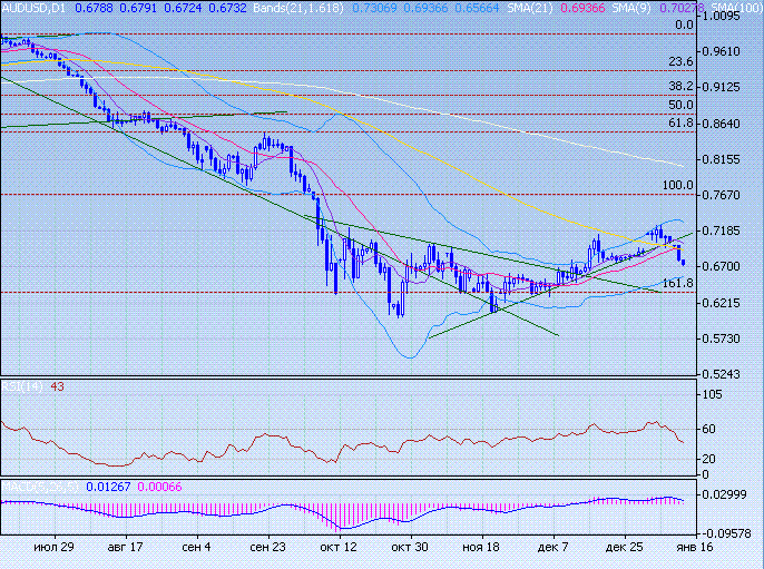 Аусси снизился, поддержку аусси оказала нижняя граница полосы Боллинжера (0,6569). Прорыв поддержки обозначит снижение аусси к 0,6360 в краткосрочной перспективе. Серия сопротивлений расположена в области 0,6920-0,6980 и несколько выше краткосрочная повышательная линия сопротивления (0,7127).