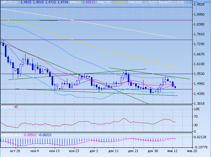 Стерлинг тестировал нижние отметки. Падение стерлинга остановила нижняя граница полосы Боллинжера (1,4454). Сопротивление при откате от нижних отметок оказала отметка 1,4650. Прорыв сопротивления или поддержки станет определяющим при выборе направления дальнейшего движения. Наиболее вероятно стерлинг в краткосрочном периоде восстановится в середину полосы Боллинжера к скользящим средним в район 1,4860. В противном случае, прорыв отметок на 1,4270 станет определяющим и стерлинг продолжит свое падение к нижним отметкам в район минимумов 2000г на 1,3920.