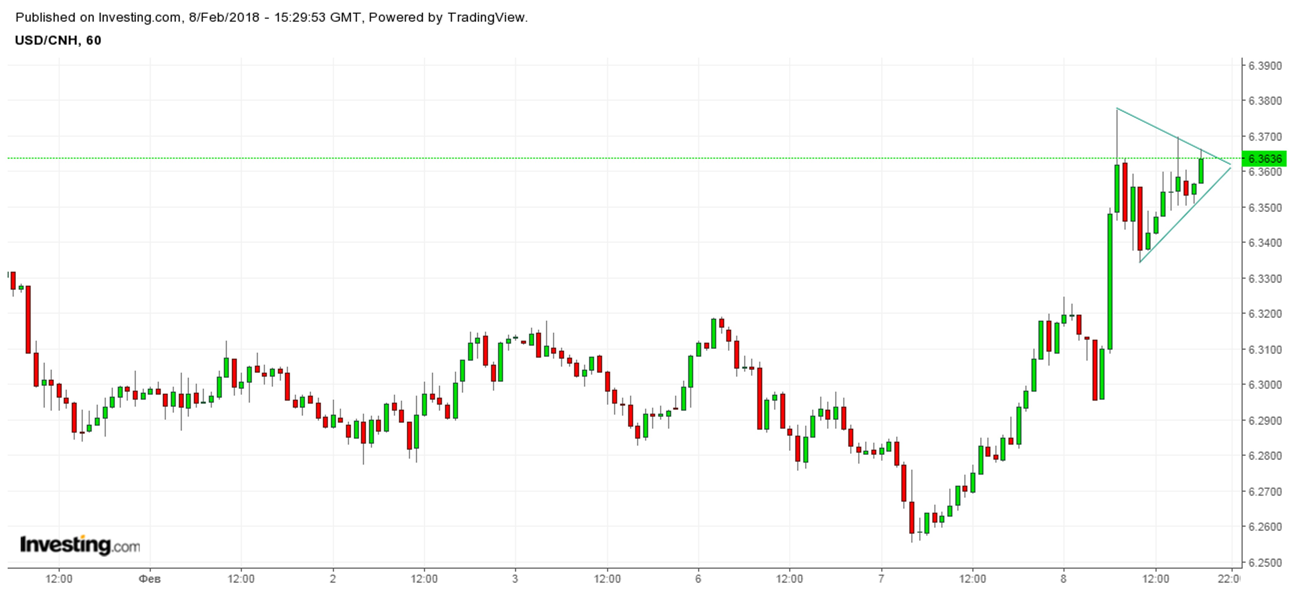 Достаточно посмотреть на динамику валютной пары доллар/офшорный юань. Там сейчас образовался треугольник. Если выход будет вверх, то доллар и в паре с евро будет укрепляться. Если же вниз, то если шансы на ослабление американской валюты.