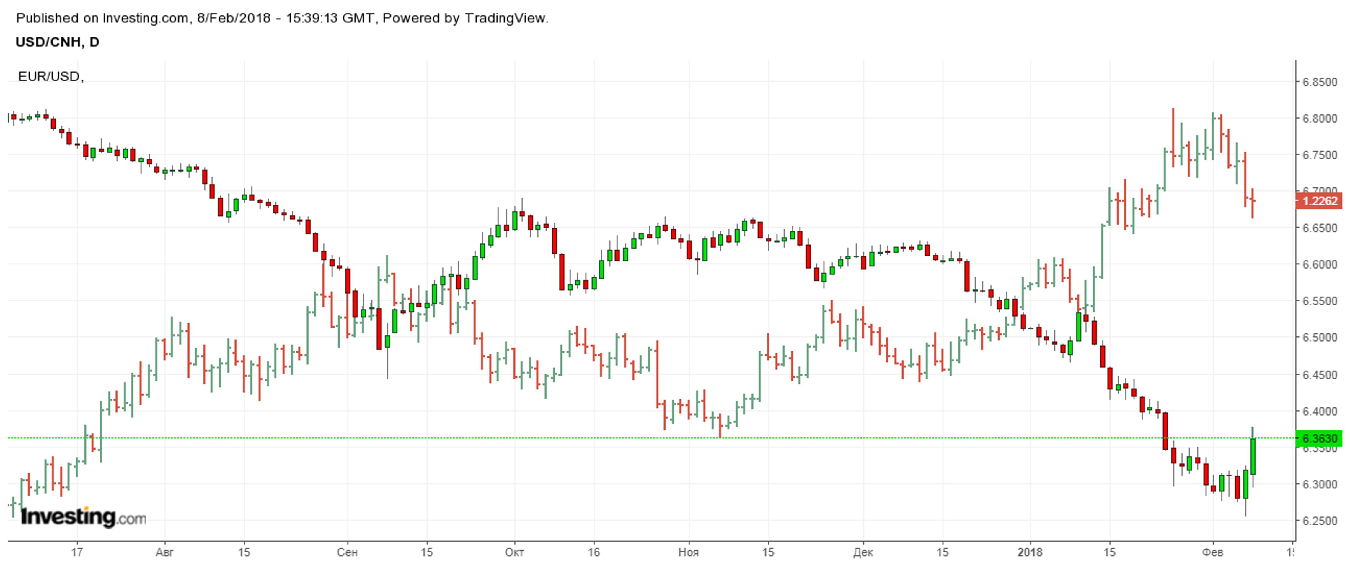 Обычно именно так и происходит. Ну а завтра утром уже китайские трейдеры и Народный банк Китая будут вести свою борьбу за власть на валютном рынке. Кстати, чтобы оценить, насколько сильно пары евро/доллар и доллар/юань взаимосвязаны, достаточно их просто наложить на один график.