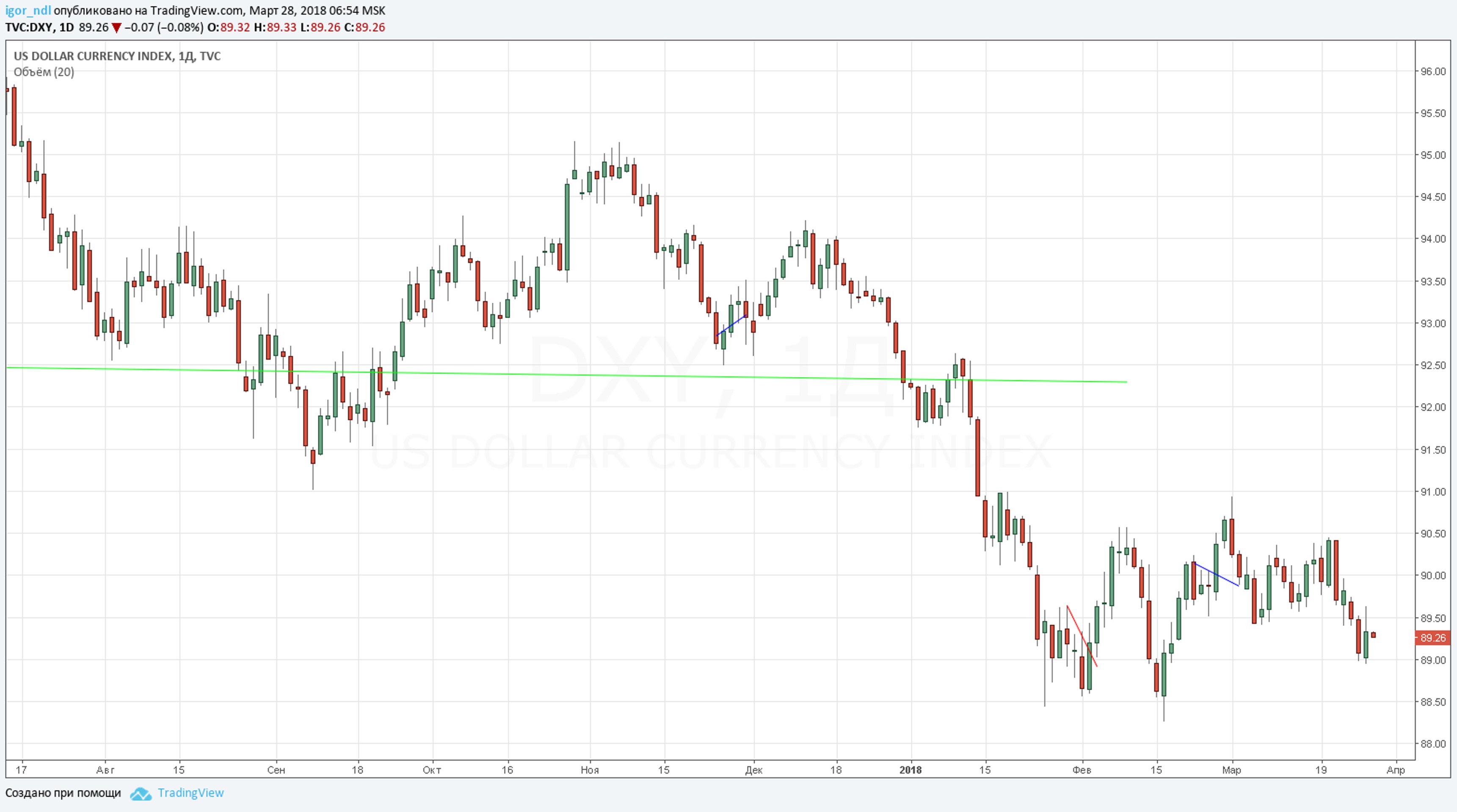 Индекс доллара к корзине шести основных валют находится на минимуме с середины февраля.