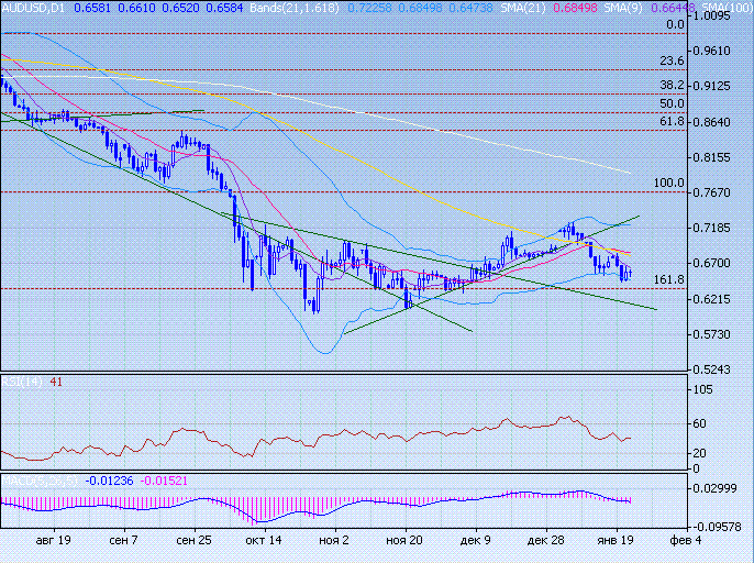 Аусси удерживается по нижней границе полосы Боллинжера (0,6480). Австралиец снижался, затем восстановил часть позиций. Следующая поддержка проходит по 0,6360, ее прорыв позволит доллару вырасти к понижательной поддержке 0,6160. Сопротивление будут оказывать скользящие средние, отметки в районе 0,6795. В ближайшие сессии ожидаем снижения аусси к поддержке 0,6360, затем видимо последует восстановление аусси.