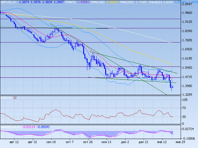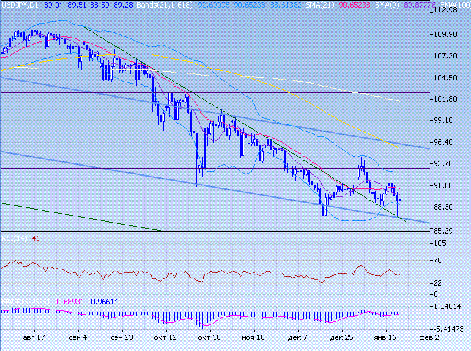 Йена тестировала минимумы 2008 г, достигнув отметки 87,09. Поддержку доллару оказала поддержка среднесрочного канала (87,09) после чего доллару удалось отвоевать потерянные позиции. Промежуточную поддержку оказывает нижняя граница полосы Боллинжера. В случае роста доллар встретит сопротивление со стороны скользящих средних.