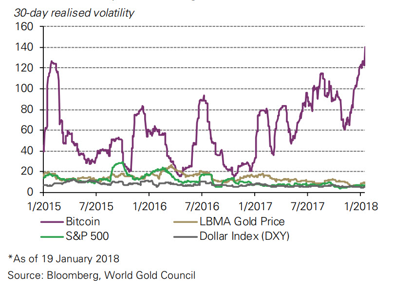 Однако продолжим говорить о рисках. Мерой риска традиционно является волатильность или изменчивость цены актива за определенный промежуток времени. На диаграмме представленной Всемирным Советом Золота (World Gold Council) показана волатильность традиционных активов: - золота, акций входящих в S&P500, доллара США, и котировок Bitcoin (рис.2).