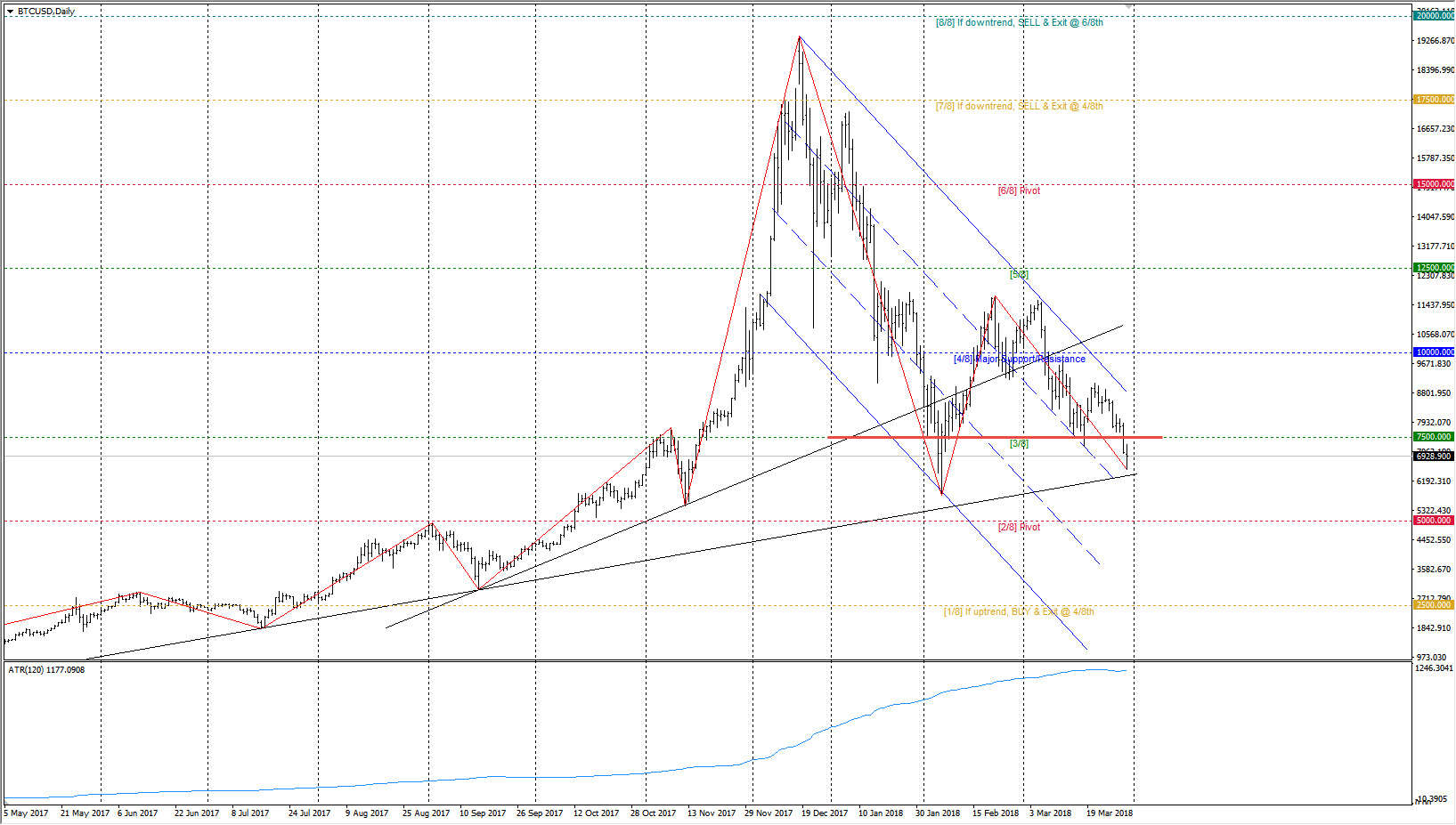 С января 2018 года, курс Bitcoin находится в понижающемся тренде, при этом вчера, 29 марта, он пробил нижнюю границу диапазона на уровне 7500, что происходит на фоне максимальных значений волатильности. Таким образом с высокой степенью вероятности следующей целью снижения выступает уровень 5000. Надо ли говорить о том, что покупать BTC в текущей ситуации это очень плохая идея? А ожидать сейчас роста Bitcoin хотя бы до уровня 15000, мечта в ближайшее время не осуществимая?