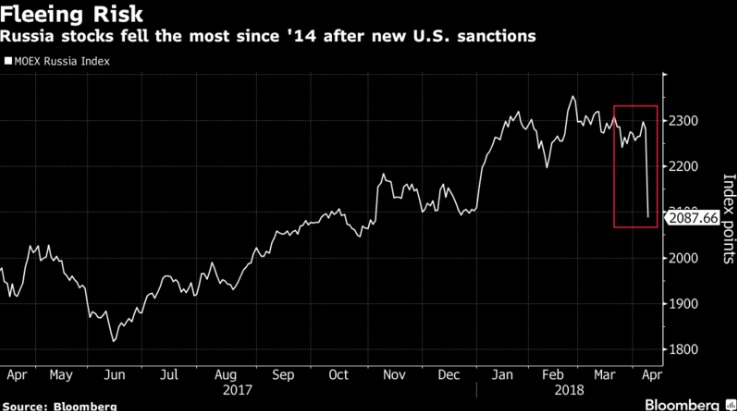 Наиболее карательные санкции США ударили по российским компаниям и олигархам, волной ударив по национальным активам и рублю, тогда как Кремль пытается сдержать ущерб. В первый торговый день недели десятки российских компаний пострадали от санкций, торгуемые в Москве акции устремились к наиболее массивному падению за 4 года, валюта показала наиболее существенное в мире падение, национальные кредитные риски также росли.