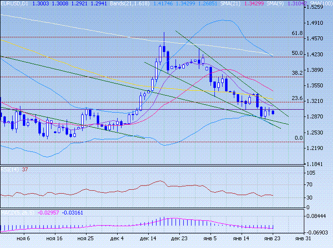 Евро не сумел преодолеть сопротивление на 1,3040, после чего снижался. Ожидаем консолидации пары между этим сопротивлением и серией поддержек в области 1,2800-1,2720. Прорыв поддержек приведет к дальнейшему снижению евро к минимумам 2008г.