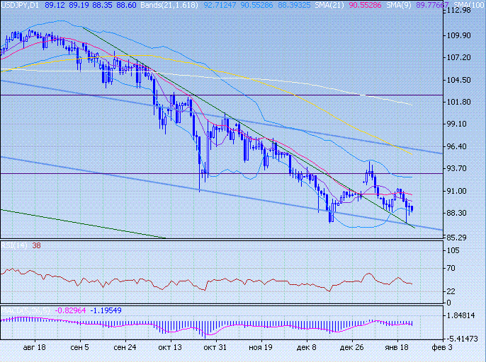 Торговля проходит по нижней границе полосы Боллинжера, прорыв которой приведет к снижению к поддержке среднесрочного канала в район 86,80. Сопротивление при росте будут оказывать скользящие средние.