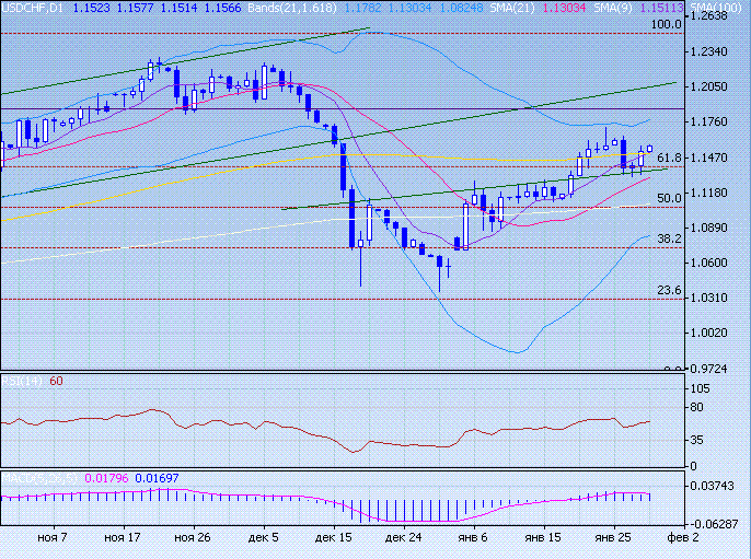 Свисси не сумел преодолеть поддержки (по графику) в районе 1,1335, после чего доллар стремительно вырос. Неспособность свисси преодолеть отметки на 1,1335, где проходит линия шеи, завершает формирование разворотной модели голова и плечи в основании, среднесрочный целевой ориентир после которой - 1,2050. Сопротивление доллару при росте будут оказывать отметки в районе 1,1655 и далее верхняя граница полосы Боллинжера. Сильные поддержки расположены в районе 1,1350-35.