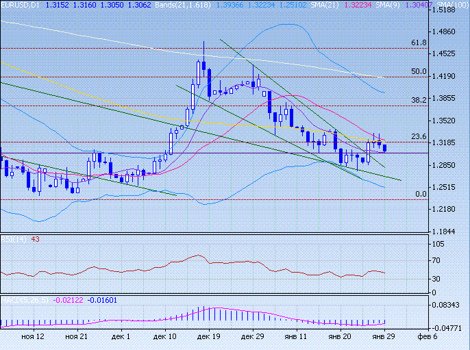 Евро не сумел преодолеть сопротивление на 1,3330, после чего снижался. Поддержку евро будут оказывать 9 МА и горизонтальная поддержка на 1,3040. Сопротивление оказывает 23,6% Фибоначчи проходящая по 1,3190. Давление на евро не ослабевает, участники рынка ожидают снижения в ближайшие месяцы ставок ЕЦБ, что нивелирует разность в доходностях по американским и европейским активам.