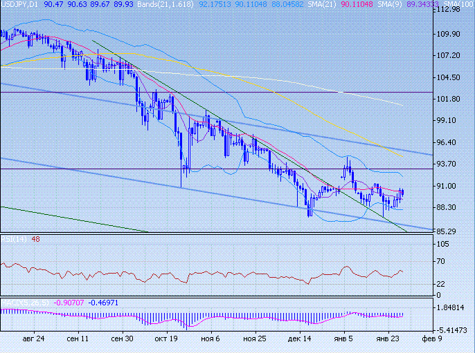 Йена утратила позиции, доллар вырос к 90,80. Сопротивление доллару при росте оказывает 21 МА. Торговля ведется в середине полосы Боллинжера, что указывает на нейтральность ситуации и вероятность что пара какое-то время будет разнонаправлено торговаться в узком диапазоне в районе сосредоточения скользящих средних порядка 9 и 21. Поддержку доллару оказывает 9 МА.