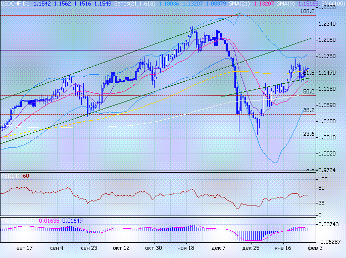 Свисси удерживается на уровнях, торгуемых в четверг. В четверг свисси даже предпринял попытки к росту, тестировал отметки на 1,1395. Картина остается прежней свисси торгуется выше (по графику) предполагаемой линии шеи (1,1365) модели голова и плечи в основании. Чем дольше пара задержится выше линии шеи, тем уверенней будет чувствовать себя доллар. Сопротивление доллару при росте будут оказывать отметки в районе 1,1655 и далее верхняя граница полосы Боллинжера. Сильные поддержки расположены в районе 1,1395-35.