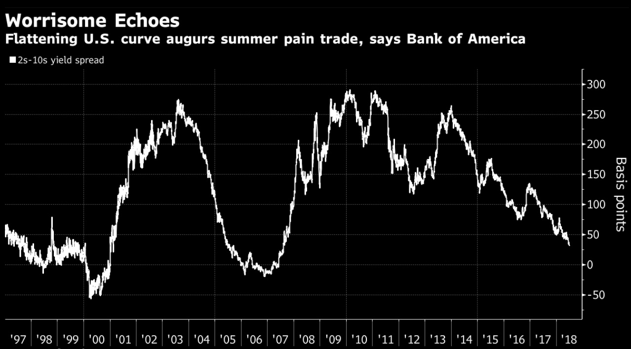 Ужесточение политики в начале 90-х заложило основу для роста доллара почти на 25% в течение 3 лет вплоть по 1998 год. Тем временем кривая доходности инвертировалась в июне того года, и здесь мы понимаем, что сейчас находимся в рамках аналогичного цикла, тогда как разрыв между доходностью двухлеток и десятилеток пробивает новые циклические минимумы.