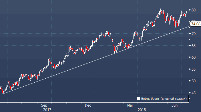 Реакция может показаться чрезмерной, однако дело сделано — сильнейшее с 2016 года падение охладит оптимизм быков, а внимание теперь сместилось к поддержке в районе $72.50/00. Здесь проходит линия тренда с июня 2017 и 23.6% этого движения — прорыв ниже будет означать формирование более масштабной вершины и даст импульс дальнейшему сокращению лонгов.