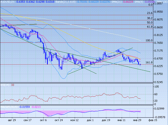 Первый месяц нового года оказался неудачным для аусси, он снижался. В то же время наблюдаем консолидацию пары с октября 2008 в широком диапазоне. Давление на аусси не ослабевает, а прорыв фигуры 0,60 приведет к дальнейшему снижению аусси в среднесрочной перспективе. Ожидаем, что аусси устоит и период консолидации в диапазоне 0,6000-0,7300 продолжится. На краткосрочных графиках аусси торгуется по поддержке 0,6330 и по нижней границе полосы Боллинжера, сдерживающей рост доллара. В случае преодоления поддержек аусси продолжит снижение в район 0,6000. Краткосрочные индикаторы RSI оказывают аусси поддержку.
