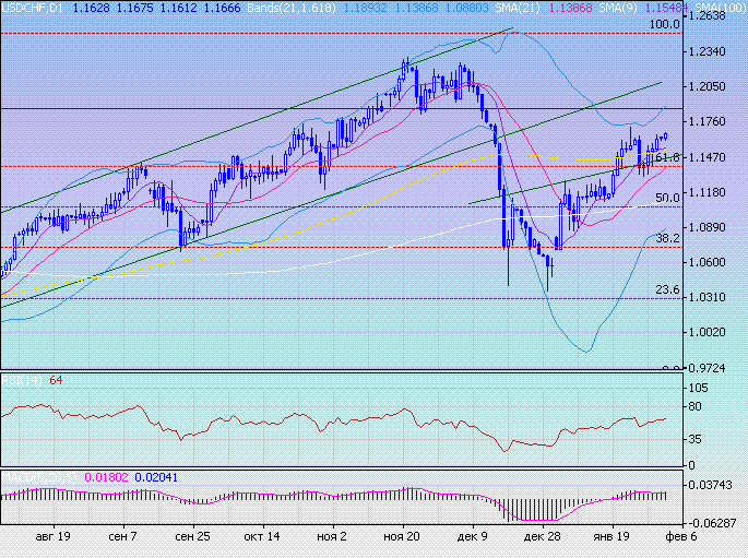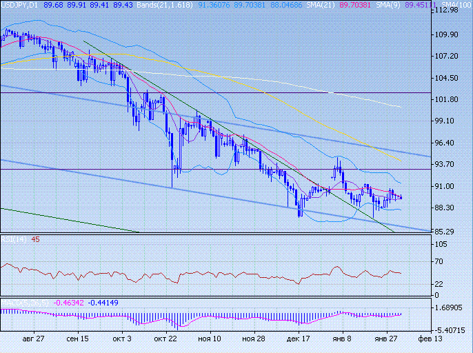 В январе пара консолидировалась на месячном графике, сформировав доджи с темным телом, что указывает на вероятное начало периода консолидации в среднесрочном периоде с последующим ростом доллара. Ключевой отметкой в этой паре является 87,10. Ее прорыв приведет к дальнейшему снижению доллара к минимумам 1995г на 83,20 и далее 79,77. На краткосрочных графиках пара консолидируется, что должно привести к откату доллара от нижних отметок в краткосрочном периоде. Торговля ведется в середине полосы Боллинжера, что указывает на нейтральность ситуации. Наблюдаем пересечение скользящих средних в сторону роста доллара.