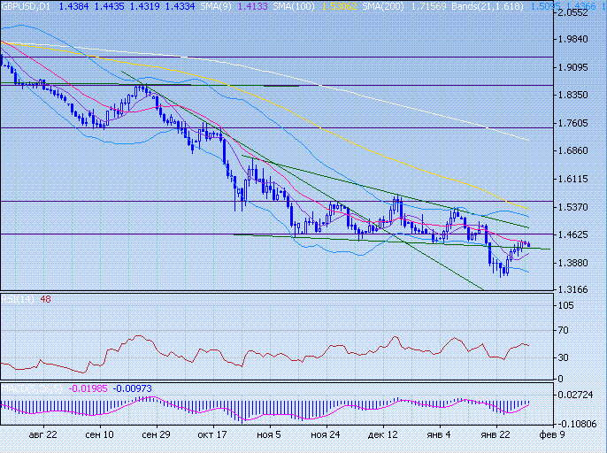 Стерлинг закрыл январь коротким темным телом с длинными тенями, пара совершала разнонаправленные движения в течение месяца, что указывает на вероятное наступление фазы консолидации в среднесрочном периоде. На краткосрочных графиках сопротивление стерлингу оказывает 21 МА. Краткосрочная понижательная поддержка на 1,4265 сдерживает падение стерлинга. Очевидно, пара сформировала промежуточную вершину и в ближайшие сессии следует ожидать снижения стерлинга. В случае если отметки в районе фигуры 1,42 не устоят стерлинг снизится к минимумам января.