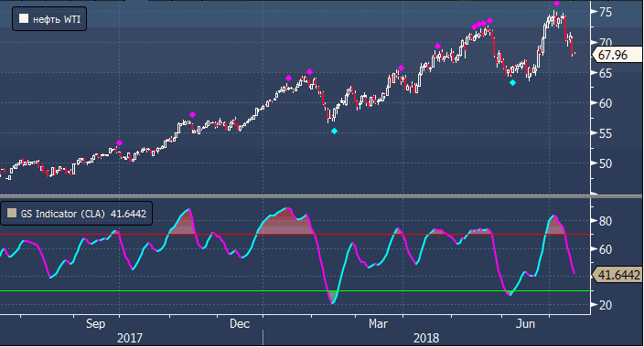 По меньшей мере один технический индикатор сигнализирует, что падение нефти может продолжиться. Индикатор глобальной силы (GTI Global Strench Indicator), который в начале этого месяца достигал так называемого уровня перекупленности, упал до минимума за три недели, но еще не достиг другого поворотного пункта. Цена нефти West Texas Intermediate упала примерно на 8% с тех пор, как индекс сигнализировал 3 июля возможный разворот.